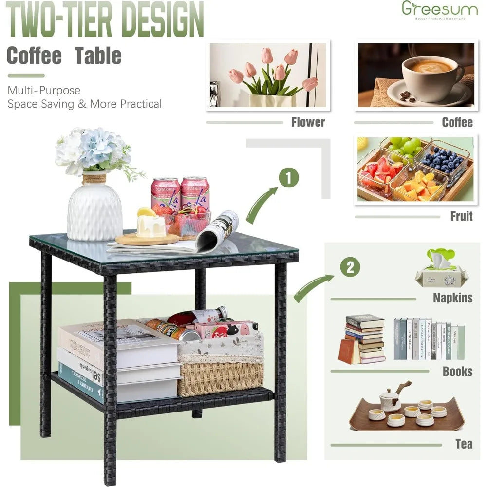 Outdoor Wicker Rocking Chairs offer a comfortable rocking experience with their curved legs, perfect for enjoying sunny outdoor relaxation. These chairs come with a two-tiered coffee table, optimizing space for your outdoor essentials. Crafted from weather-resistant rattan material, they are accompanied by two waterproof cushions to protect the furniture from the elements. The lightweight and decorative patio furniture can be effortlessly moved to various outdoor locations such as poolside, gardens, yards, porches, or balconies. Assembly is straightforward and convenient, ensuring a simple setup process.