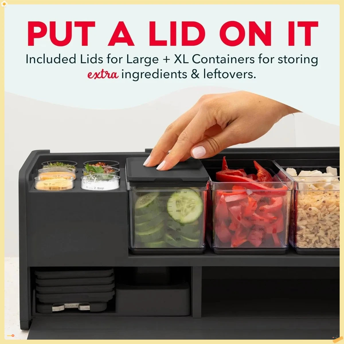 MORE CAPACITY & SLIP-FREE STORAGE: This deluxe kit contains all the essential tools to streamline chopping, grating, peeling & more: redesigned seamless cutting board with stronger magnets, 8 prepping tools, plus 2 small, 2 medium, 3 large & 1 XL durable, food-safe containers with 20% more capacity & larger, clearer measurement indicators in ounces, milliliters & cups. Plus flat-bottom, no-tip mini containers, super-seal lids, removable scrap bin & a built-in storage unit.